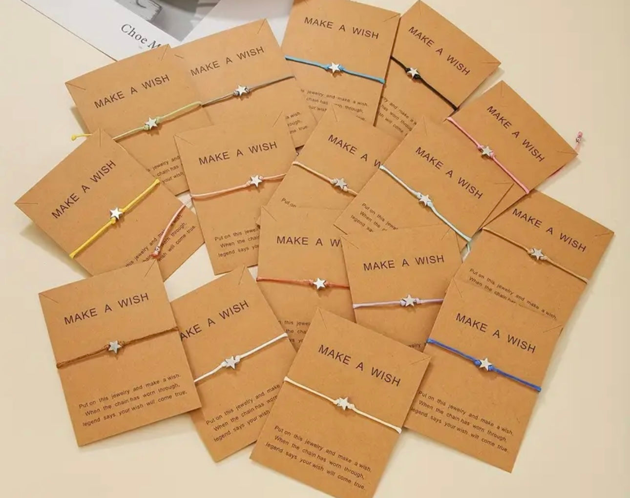 Make a wish cord bracelets with star charm - mounted on a cardboard holder with a little poem.